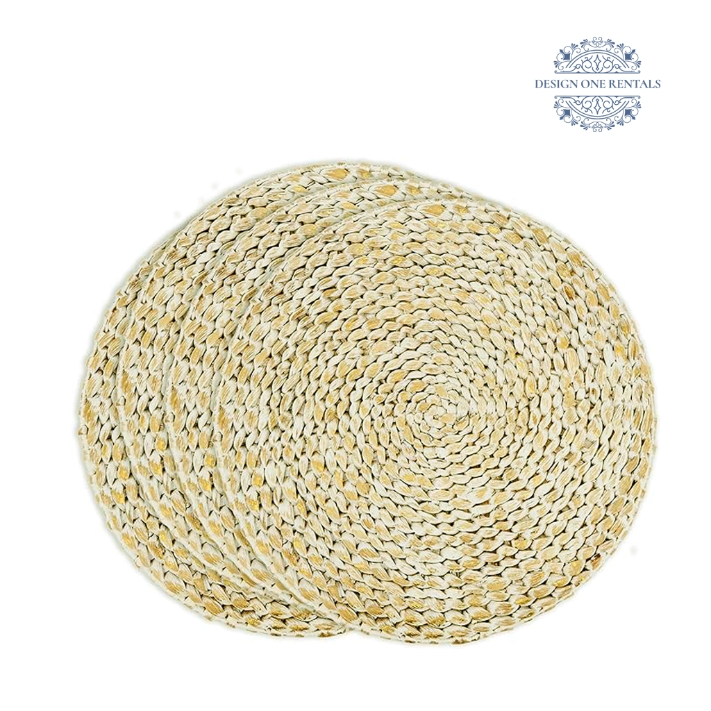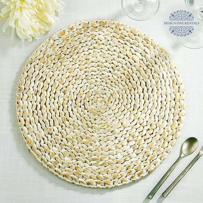 The Antique Bamboo Charger Plate features a round, handwoven design crafted from natural fibers in soft beige, tan, and white tones. Its tightly braided pattern adds rich texture and rustic charm, making it perfect for boho, tropical, or coastal-inspired events. Ideal for event planners and party rental setups, this charger plate brings an organic warmth to outdoor receptions, garden parties, or casual gatherings. Best paired with our  Allora Champagne Collection for a natural and stylish tablescape.