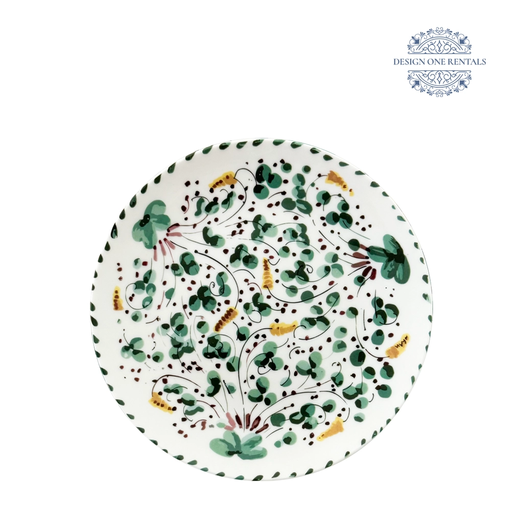 The Codi Green Charger Plate features a hand-painted floral design with vibrant green and golden-yellow accents on a crisp white base. Maroon details and a leafy green border add a touch of artistry, making it perfect for spring weddings, garden parties, or nature-inspired celebrations. Ideal for event planners and rental collections, this charger brings warmth and creativity to any tablescape. Pair it beautifully with our Artisan Clear Collectionfor a refined yet lively presentation.