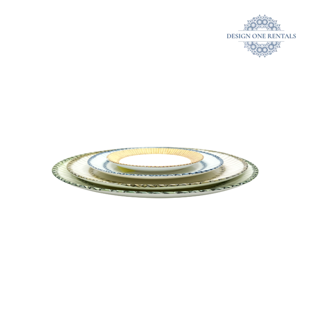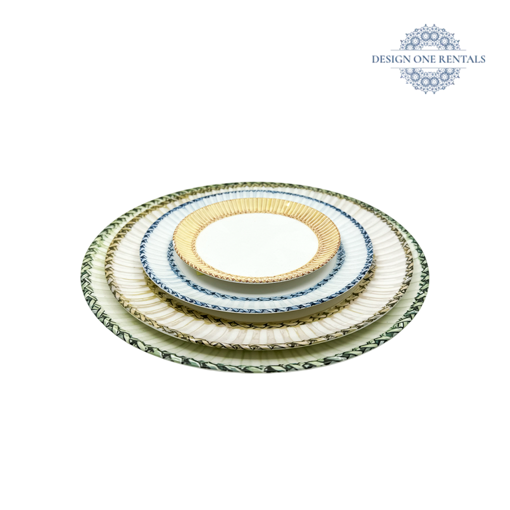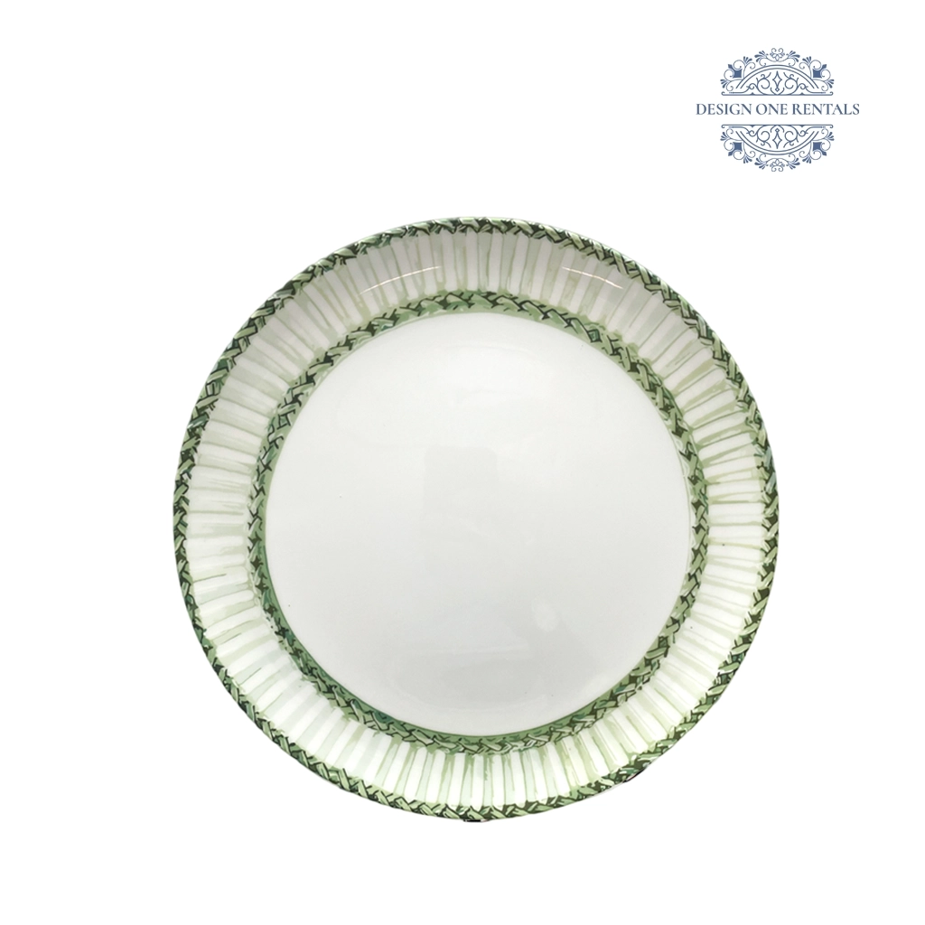 The Firenze Verde Charger Plate features a beautifully braided border in soft green tones, combining refined craftsmanship with a touch of natural charm. Its intricate rim detailing adds texture and depth, while the smooth white center complements a variety of table settings. Perfect for rustic-chic weddings, garden celebrations, or outdoor gatherings, this charger pairs wonderfully with Valencia Gold Collection. A timeless choice for event planners looking to add warmth and sophistication to their tablescapes.