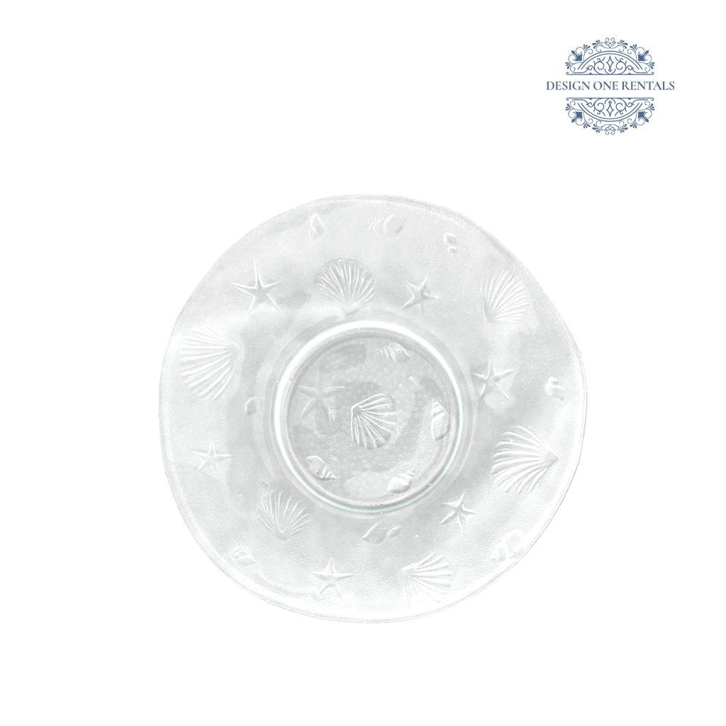 The Frosted Fossil Charger Plate showcases embossed sea-inspired details with seashells, starfish, and marine motifs delicately arranged around the rim. Its clear glass design and textured surface bring a soft coastal charm, perfect for beach weddings, tropical parties, and ocean-themed events. Ideal for event planners and party rental styling, this charger plate adds texture and light to any table setting. Best paired with our Valencia Stainless Collection for a refreshing seaside look.