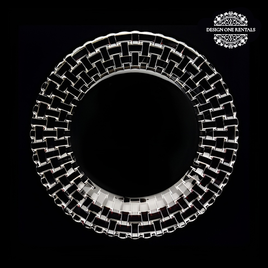 The Vetri Charger Plate showcases a bold woven lattice rim crafted from reflective silver-toned material, offering a modern and luxurious appeal. Its interlocking geometric design and glossy finish create depth and visual interest, making it a standout piece for sophisticated events or contemporary themes. Perfect for galas, weddings, or corporate gatherings, this charger adds a polished metallic touch to any tablescape. Pair it best with Roxbury Gold Collection for a refined modern look.