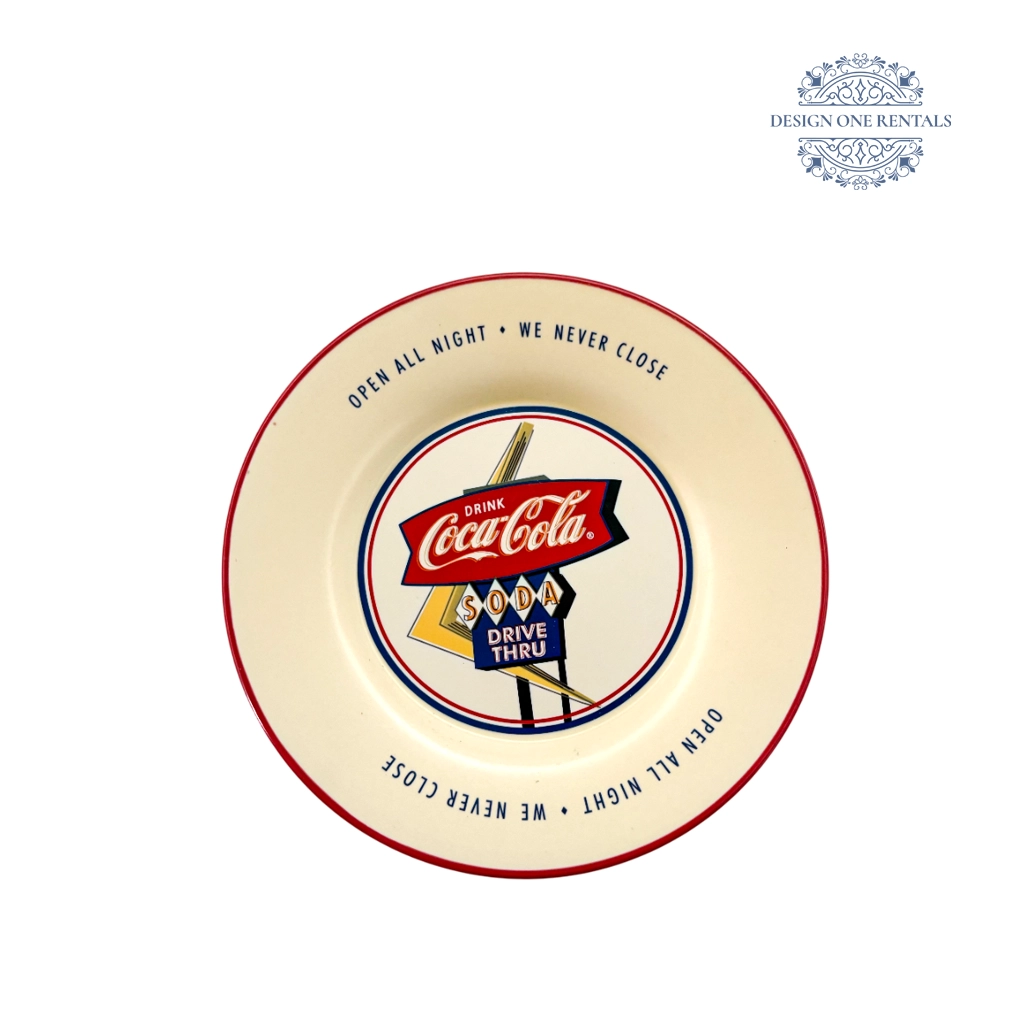 The Coca-Cola 10-Inch Dinner Plate brings retro diner style to the table with a warm cream base and a bold “Coca-Cola Soda Drive Thru” graphic in classic red, blue, and yellow. Finished with playful “OPEN ALL NIGHT” and “WE NEVER CLOSE” lettering and a bright red rim, it’s a standout choice for themed parties, vintage events, and fun casual dining setups. This plate pairs perfectly with our Flora Charger Plate, Valencia Stainless Collection, Bubble Clear Collection, and checkered or denim-look linens for a complete throwback tablescape.