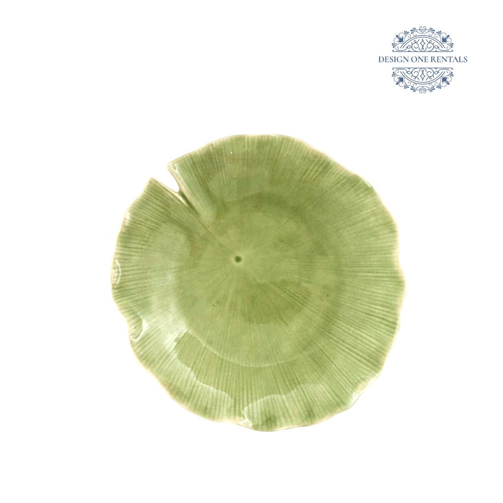 The Lily Pad Sage 10Inch China Plate features a muted sage green finish with an organic lily pad shape and subtle radiating lines for texture. Perfect for garden, nature-inspired, or boho-themed events and party rentals. Pair this with our Laguna Rattan to highlight its organic, artisanal design.