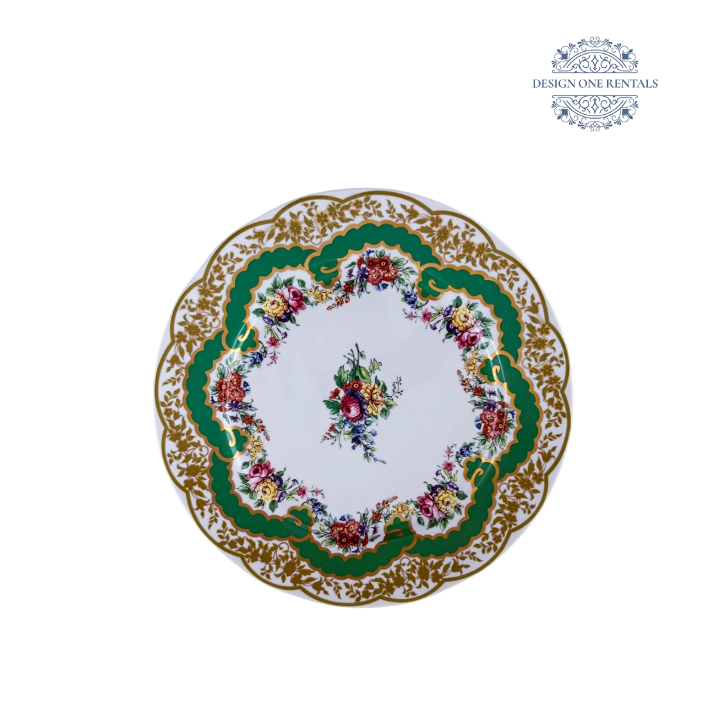 The Baroque Verde China Plate showcases an ornate gold-filigree scalloped rim, a rich green band, and a vibrant floral bouquet at the center for a striking, classic look. Its detailed design pairs well with our Grace Clear Collection for timeless table settings.