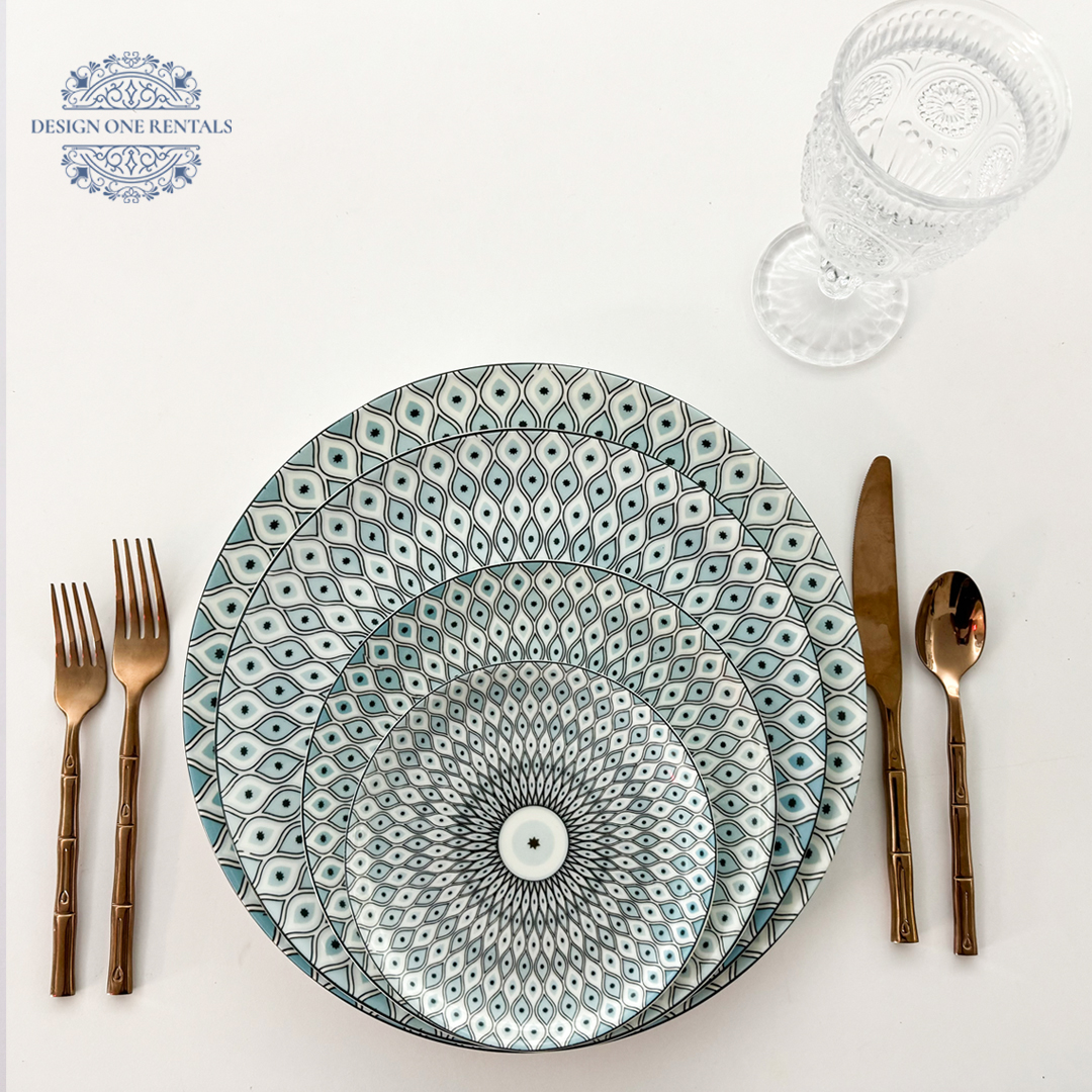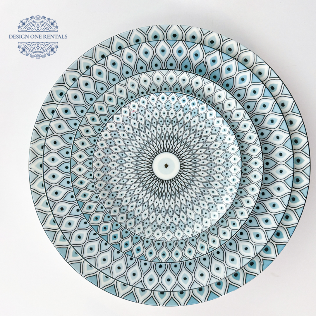 The Evil Eye Collection China Plate showcases a bold geometric design inspired by the iconic evil eye motif, with detailed teardrop patterns radiating from a central star. Its striking mix of azure blue, black, and white creates a dynamic visual that stands out for modern events, themed celebrations, and curated party rentals. Available in multiple sizes, this plate is ideal for event planners layering statement-driven place settings with cultural flair. Pair it with Sophie Glass  to let the pattern take center stage.
