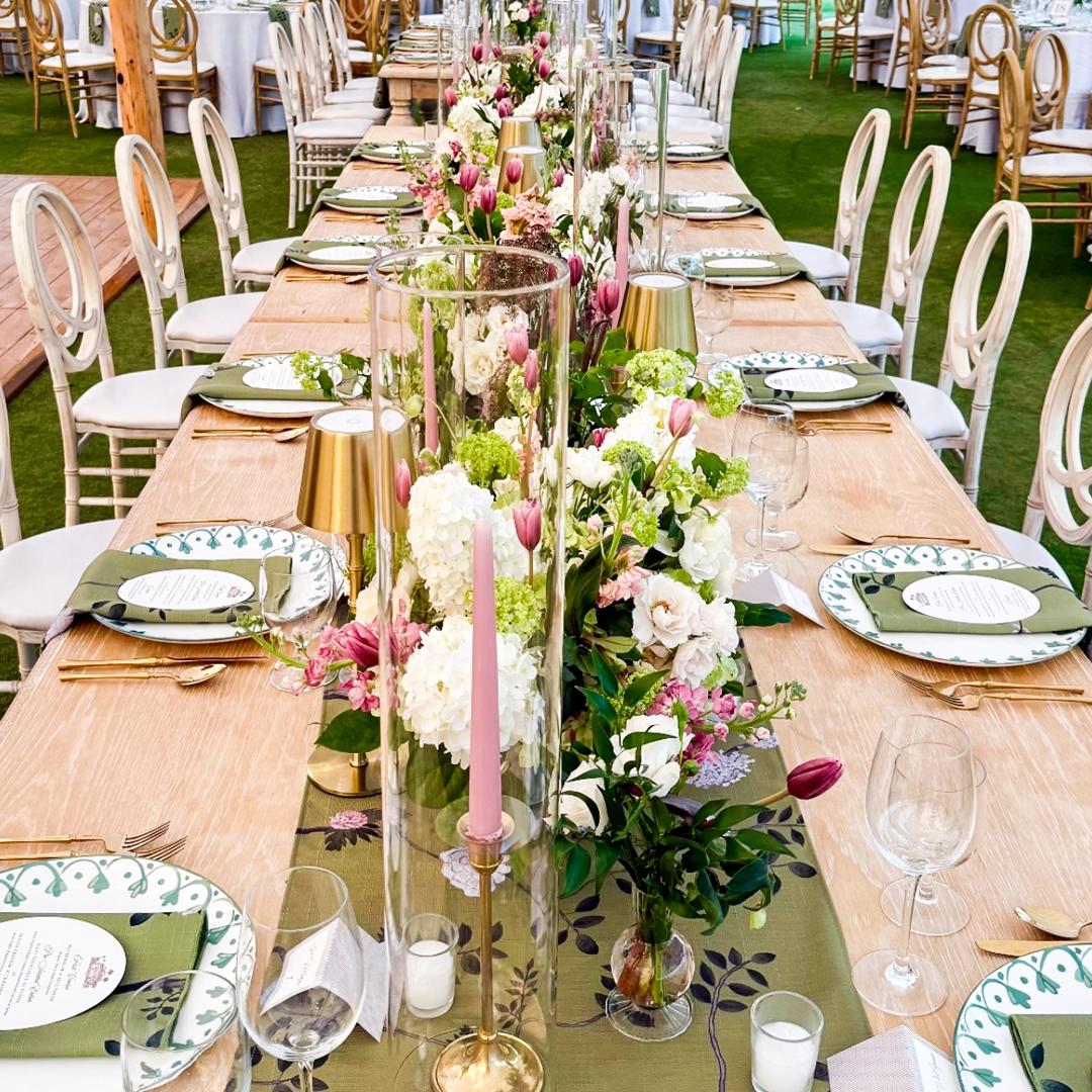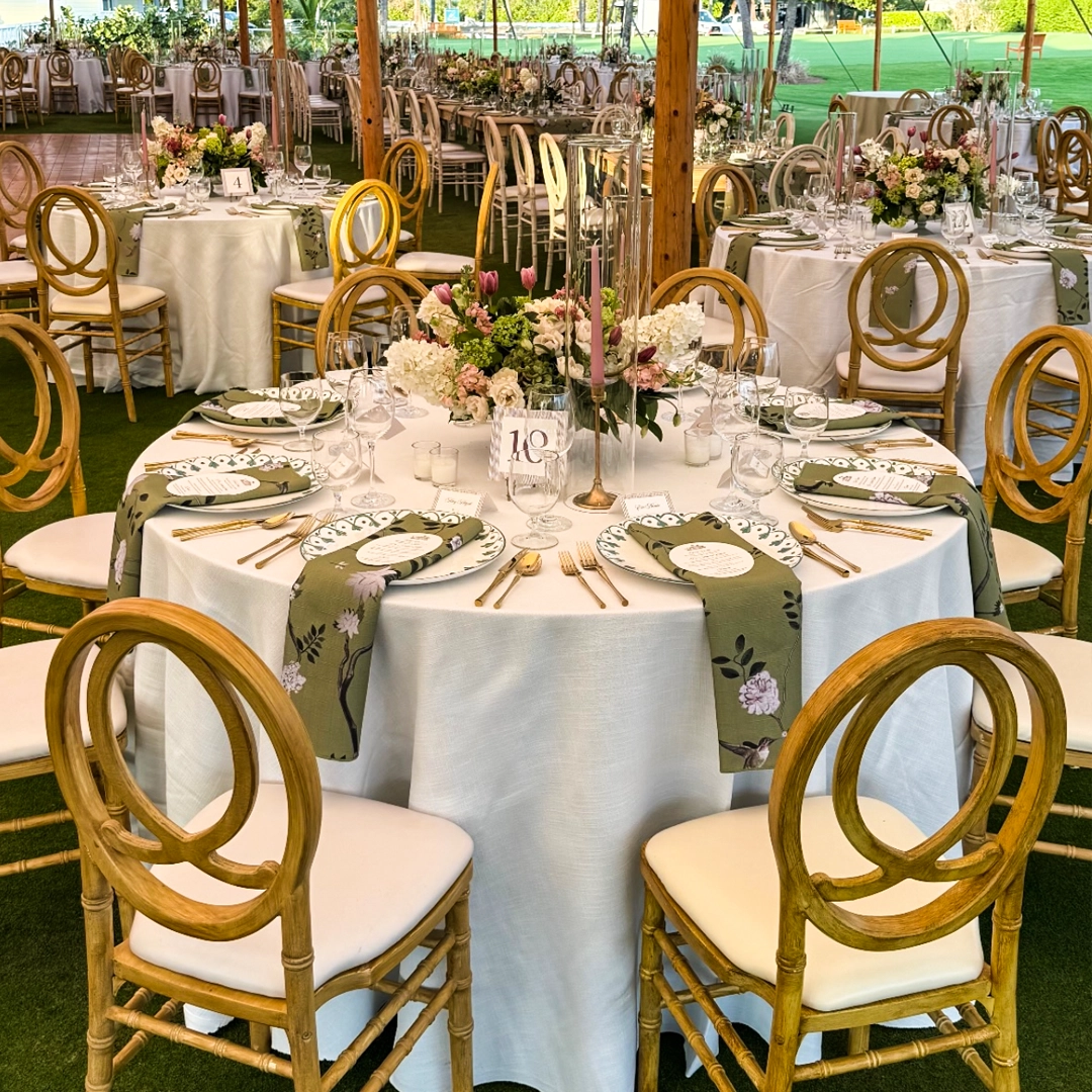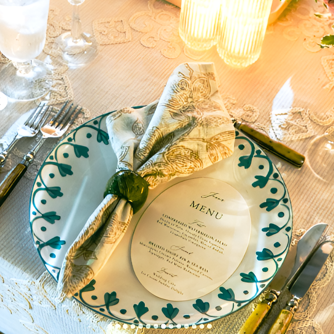 The Linea Verde China Set showcases a detailed white-centered design framed by layered floral, leaf, and scroll motifs that create a striking visual impact. Available in multiple sizes, it pairs beautifully with our Goa Gold Collection for refined event styling.