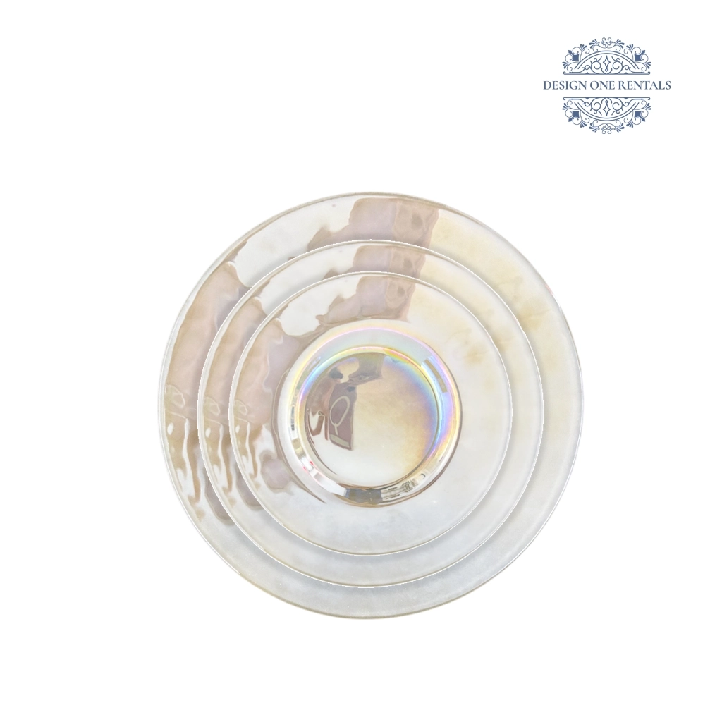 The Pearl Iridescent Collection Dinner Plate showcases a luminous glass surface with shifting rainbow tones and a soft, pearl-like texture. Its clean silhouette and radiant finish make it ideal for modern weddings and fashion-forward tablescapes. Pair this with our Hudson Stem Clear Collection glassware and Irene Silver Collection to enhance its iridescent glow.