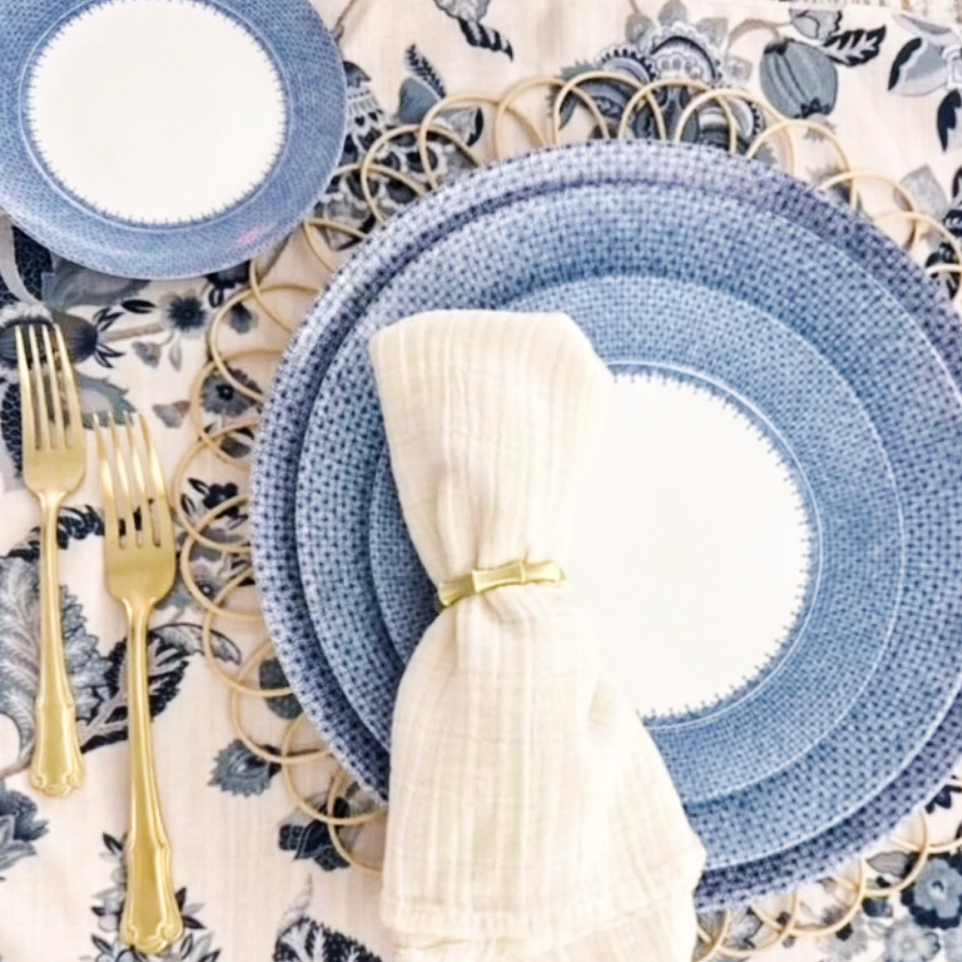 The Trieste Blue Collection China Plate features a dense, all-over micro-pattern of interlocking blue star and floral motifs arranged in subtle concentric bands around a crisp white center. Its detailed border adds visual depth to layered place settings, making it a strong choice for weddings, formal dinners, and curated party rentals. Available in different sizes, it pairs well with Artisan Clear Collection.