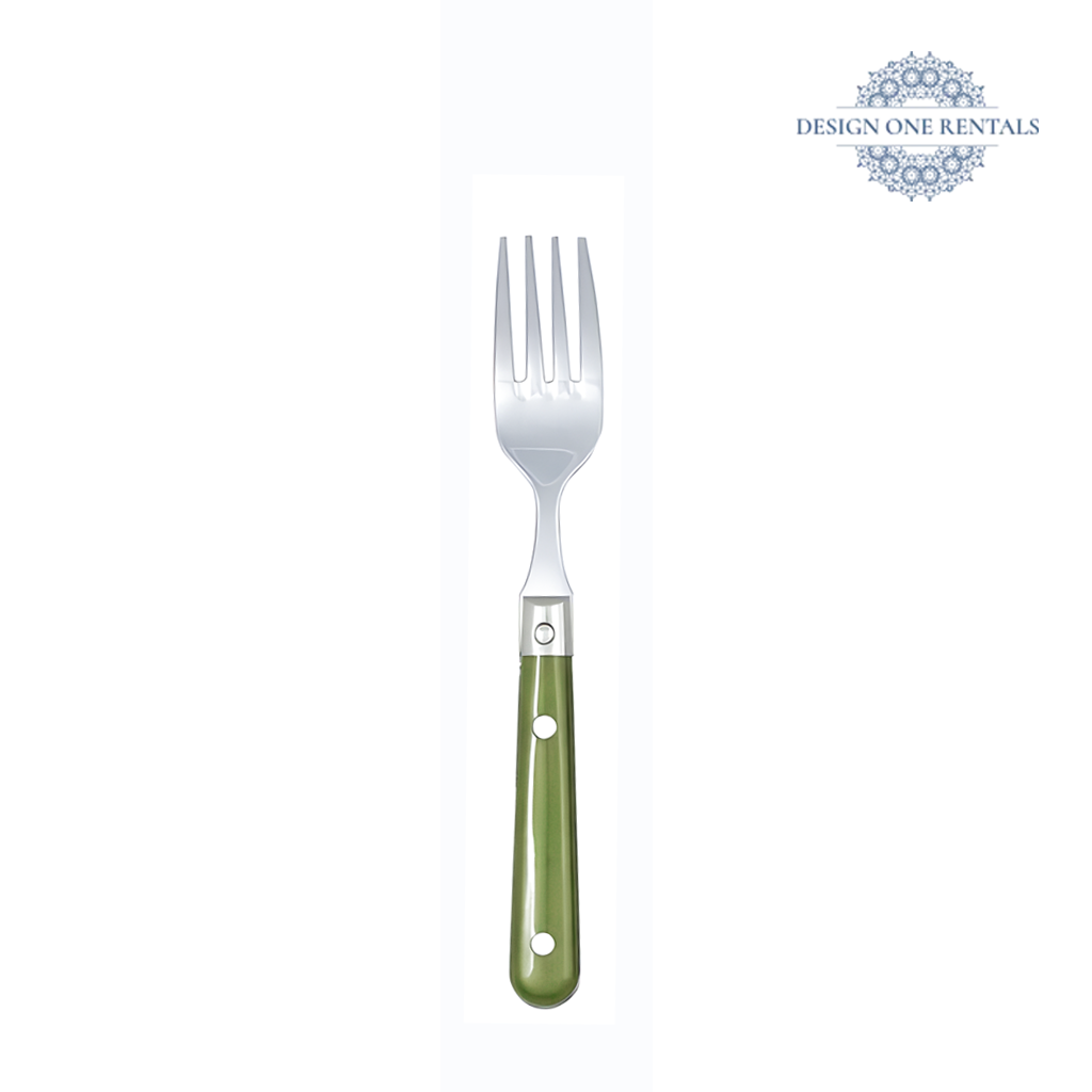 The Jardin Moss Green Collection flatware features glossy moss green handles with classic silver rivets and polished stainless steel heads, offering a fresh bistro-style look. It pairs well with our Antique Verde Collection dinner plates, Flori Natural charger plate, and Bubble Clear Collection for relaxed garden and outdoor table settings.