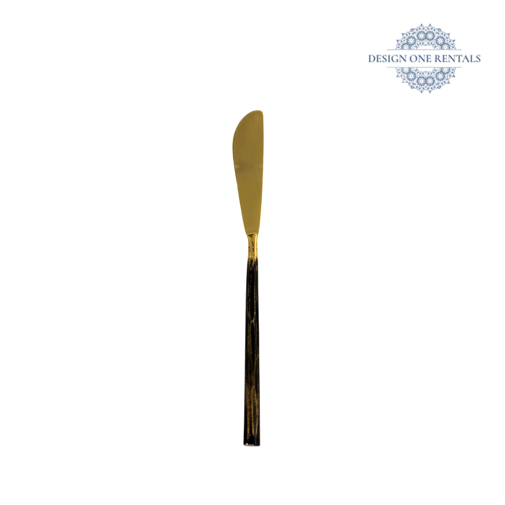 The Jessica Gold Collection flatware features slim black textured handles with organic gold-flecked detailing and high-shine gold heads for a bold, artistic table statement. Best paired with our Duchess Faces I dinner plate, Verona Black and Gold charger plate, or Flora Etched Clear Collection glassware for striking contemporary settings.