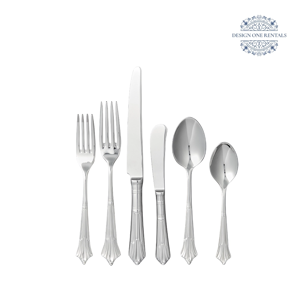 The Empire Stainless Collection features substantial flatware with classical, architectural detailing that brings a regal presence to formal tables, styled seamlessly with our Zenith Nero Collection dinner plates, Monte Carlo Gold Rim charger plate, and Power Stem Clear Collection glassware for formal weddings and traditional celebrations.