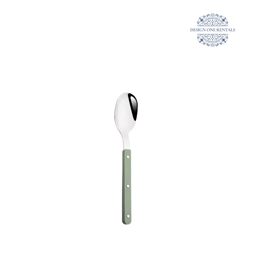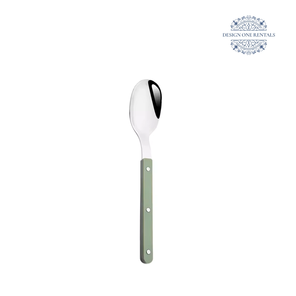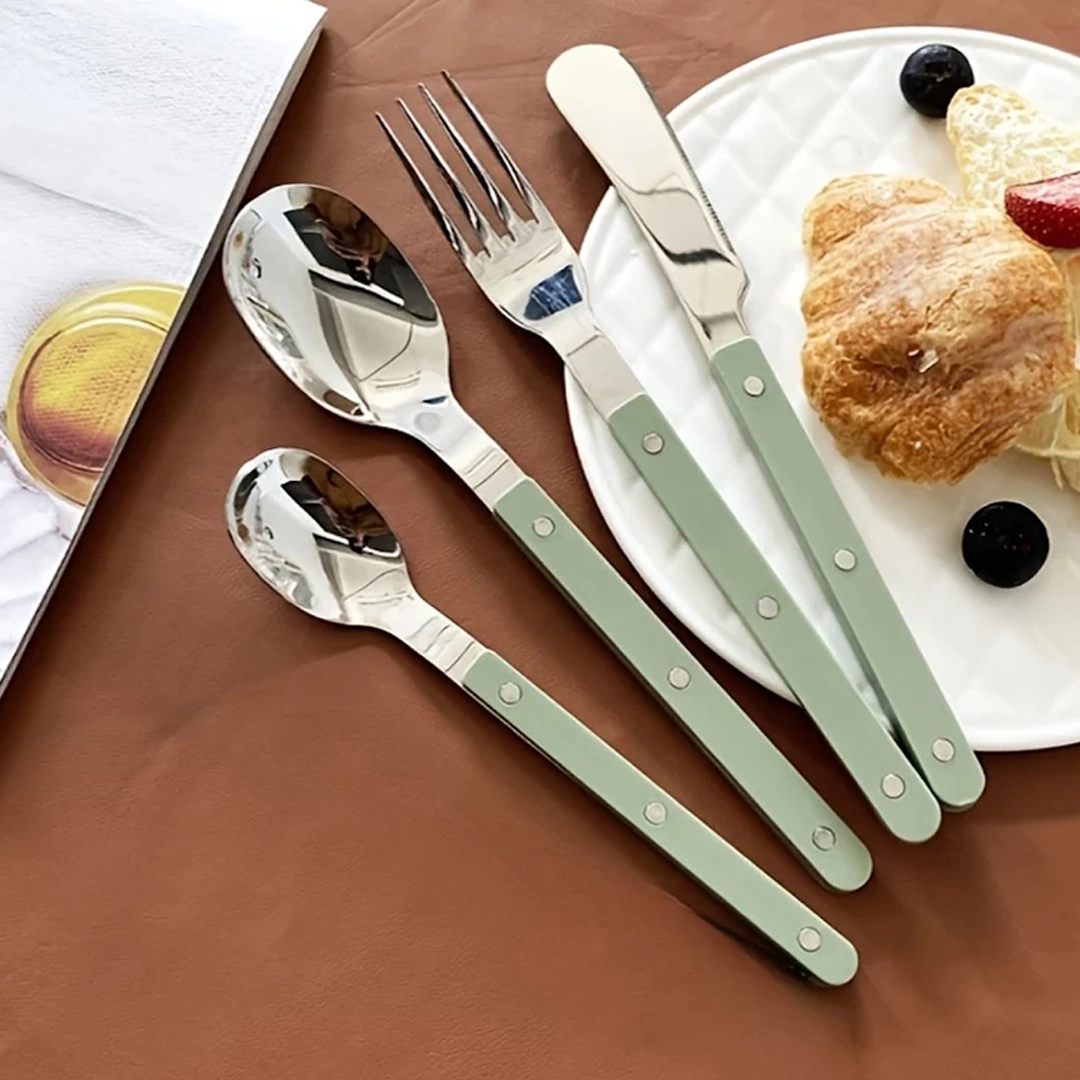The Jennifer Collection flatware features vibrant sage green handles with polished stainless steel heads, perfect for casual brunches and pairs beautifully with our The Neutral Palm Collection dinner plates, Antique Light Green, or colorful tableware.