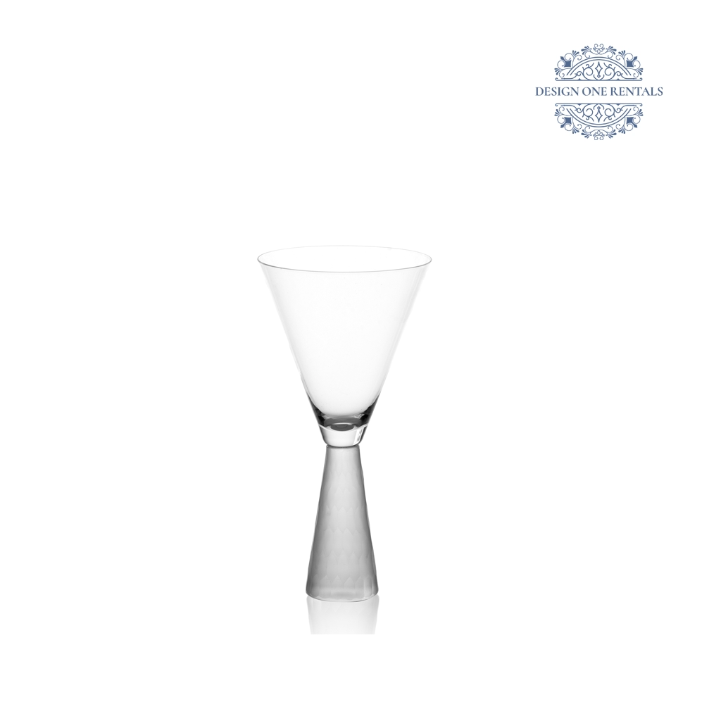The Bella Clear Collection features a modern two-piece stemware design with a clear bowl and solid frosted base, styled beautifully with our Antique Gold plate, Monte Carlo Gold Rim charger, and Ethan Brushed Gold flatware.