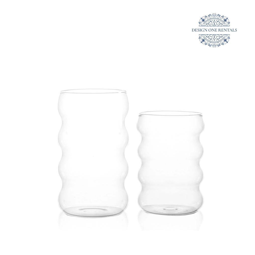 The Bubble Clear Glass features a rippled, stacked-bubble silhouette for a modern look, styled it with our Neutral Palm plates, Chloe Clear charger, and Two Tone Black and Champagne flatware for contemporary table settings and stylish events.