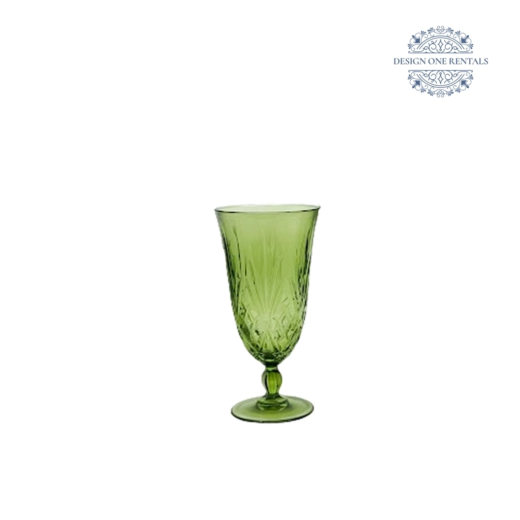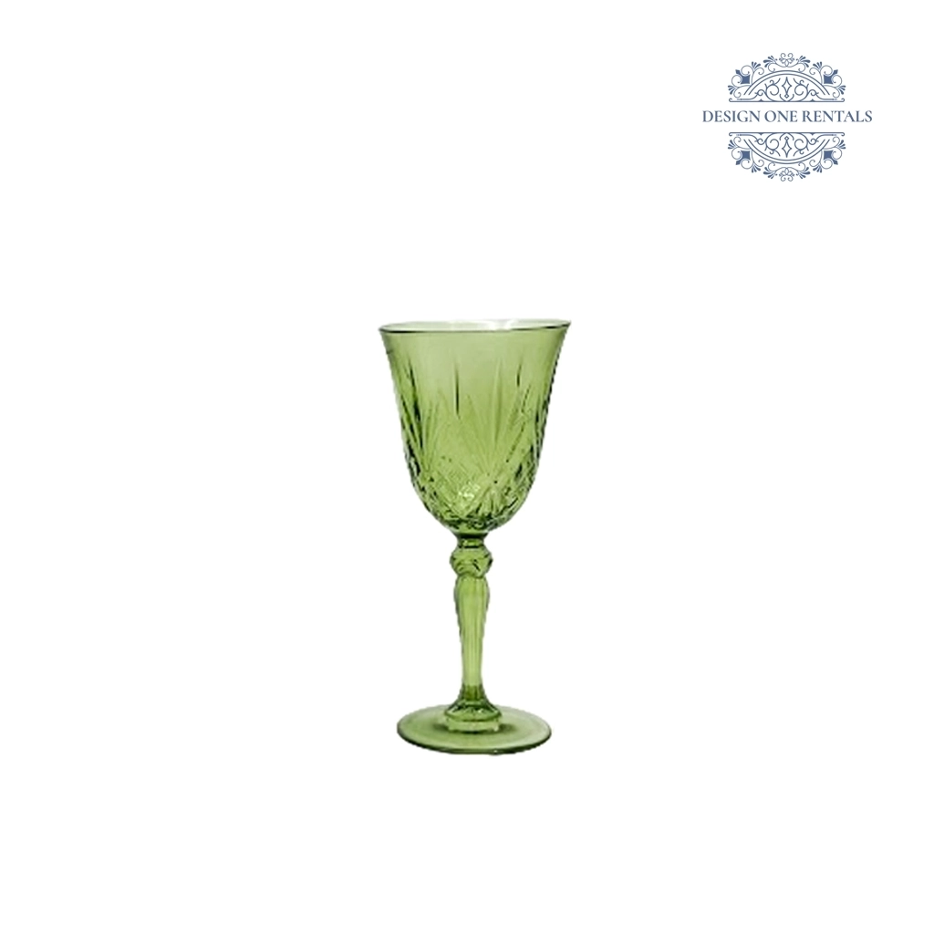 The Crystal Cut Faint Green Collection showcases a soft moss-green tint with diamond and vertical crystal cuts across highballs, tumblers, wine goblets, and champagne flutes, styled with The Antique Verde plates, Allora Champagne flatware, and Laguna Rattan charger for garden weddings, spring events, and classic receptions.
