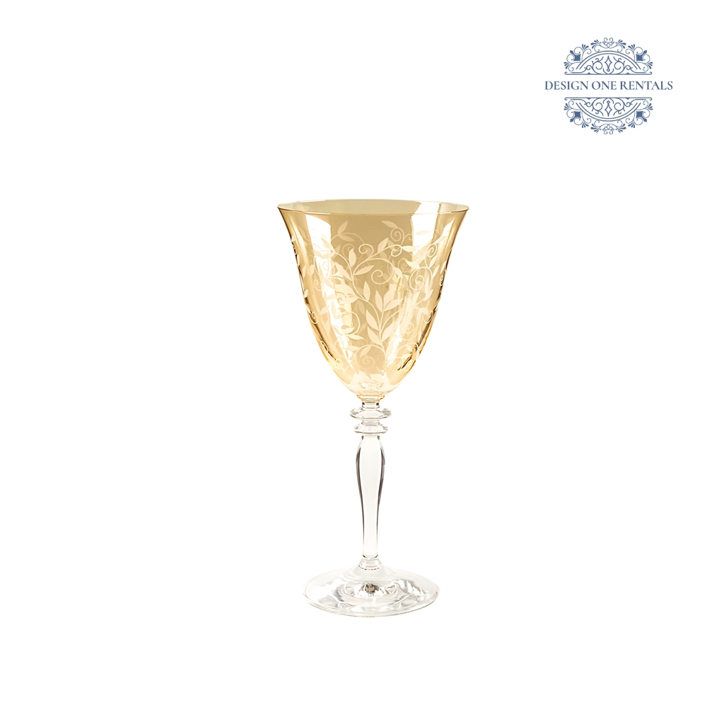 The Remembrance Collection showcases amber-tinted glassware with etched vine florals and classic baluster stems, styled with Dune plates, Irene Gold flatware, and soft linen accents for weddings, anniversaries, and formal evening celebrations.