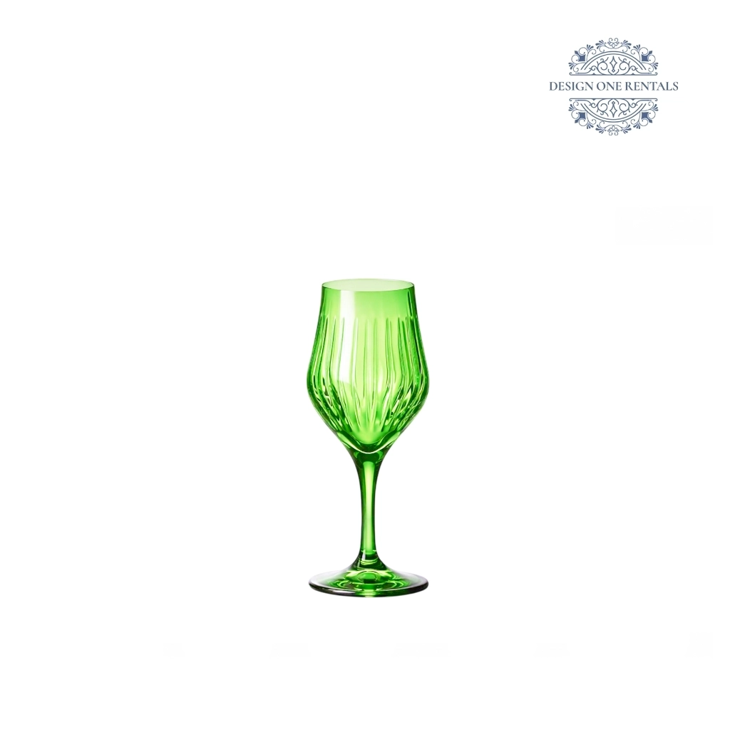 The Timeless Tulip Green Collection features jewel-toned emerald glass with a classic tulip silhouette and optic texture, styled with white porcelain plates, Roxbury Gold flatware, and Thin Gold Rim charger for garden weddings, outdoor receptions, and nature-inspired events.