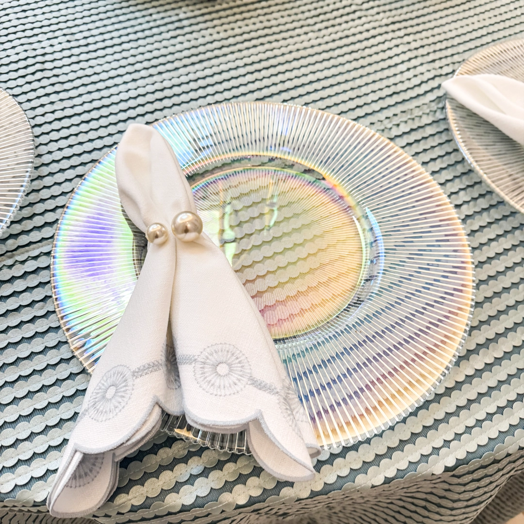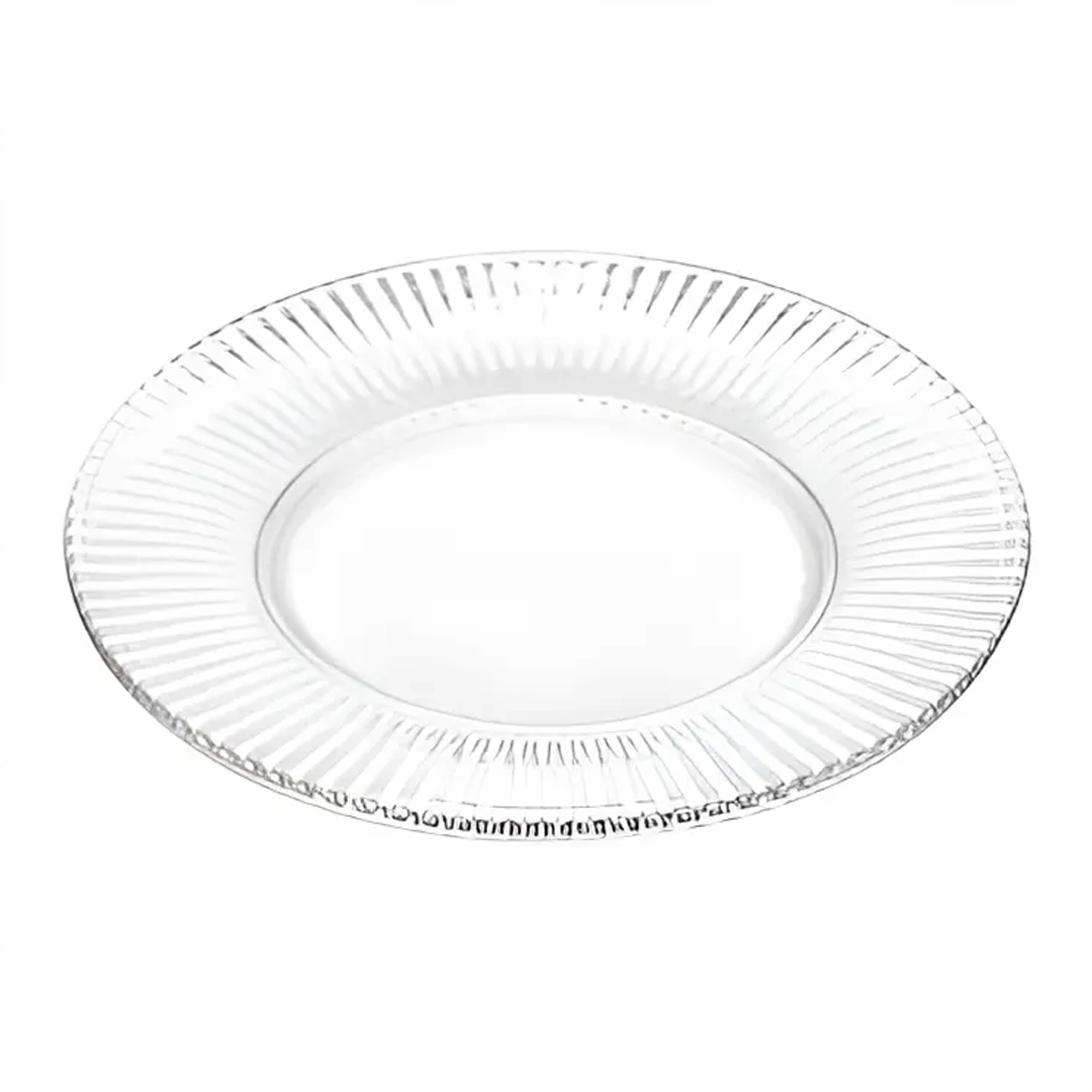 The Clear Ridge Dinner Plate features a refined fluted pattern that radiates from the center to the rim, creating a beautifully textured design. Its clear glass construction and vertical ribbed detailing catch the light, adding depth and sophistication to any event setup. Perfect for event planners and party rental styling, this timeless plate complements both modern and classic tablescapes. Best paired with our Silver Stem for a polished presentation.