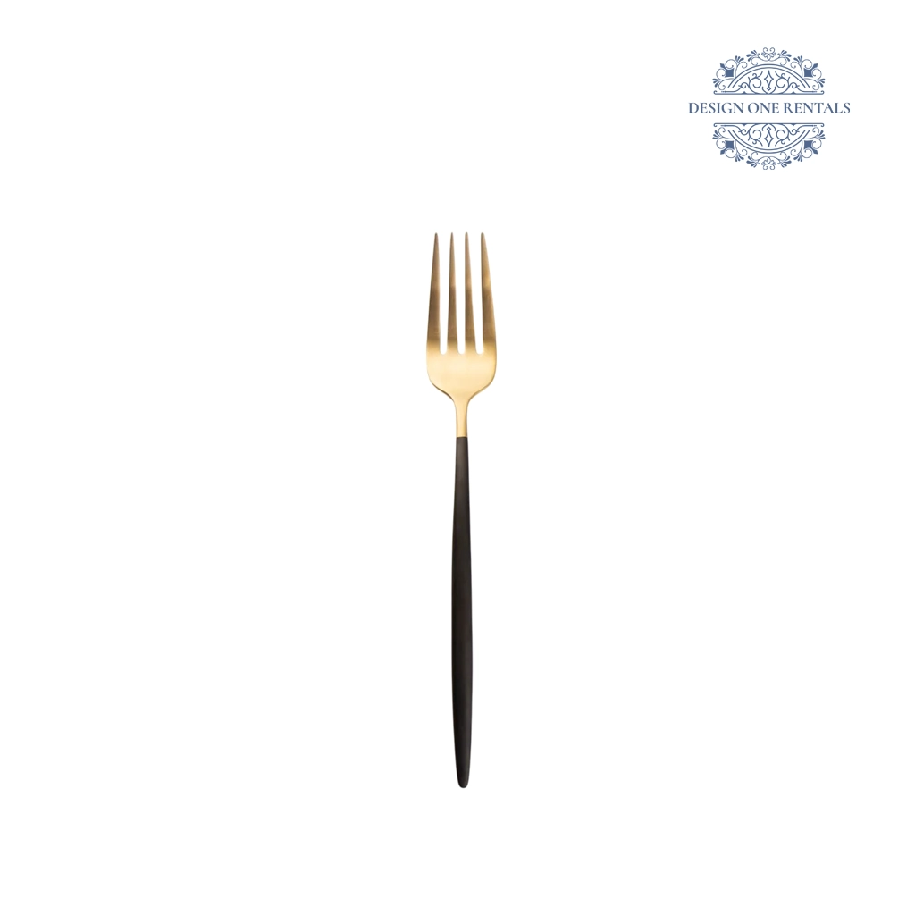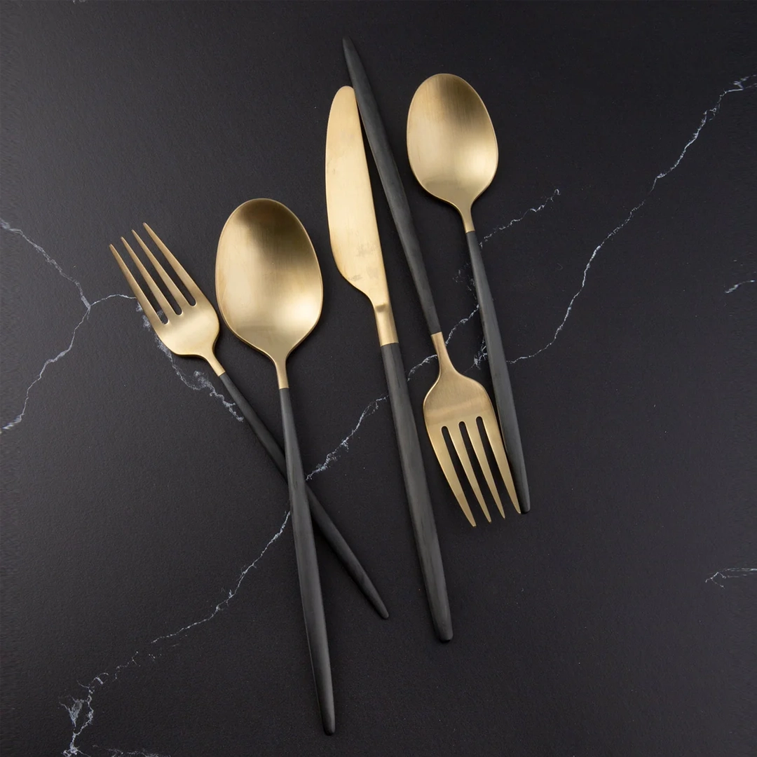 The Two Tone Black and Champagne Collection flatware features slim matte black handles paired with champagne gold heads for a bold, modern contrast. It pairs well with our Verona Black and Gold charger plate and Hudson Stem Black Collection glassware for contemporary and industrial-style table settings.
