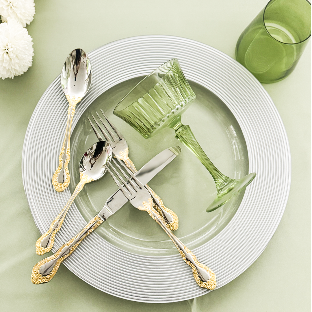 The Timeless Faint Green Coupe features a wide flared bowl in translucent olive-green glass with ribbed texture and a tall fluted stem, styled with Two Tone Black and Champagne  flatware, Corina Collection dinner plates, and Thin Gold Rim charger for modern weddings, cocktail hours, and formal events.