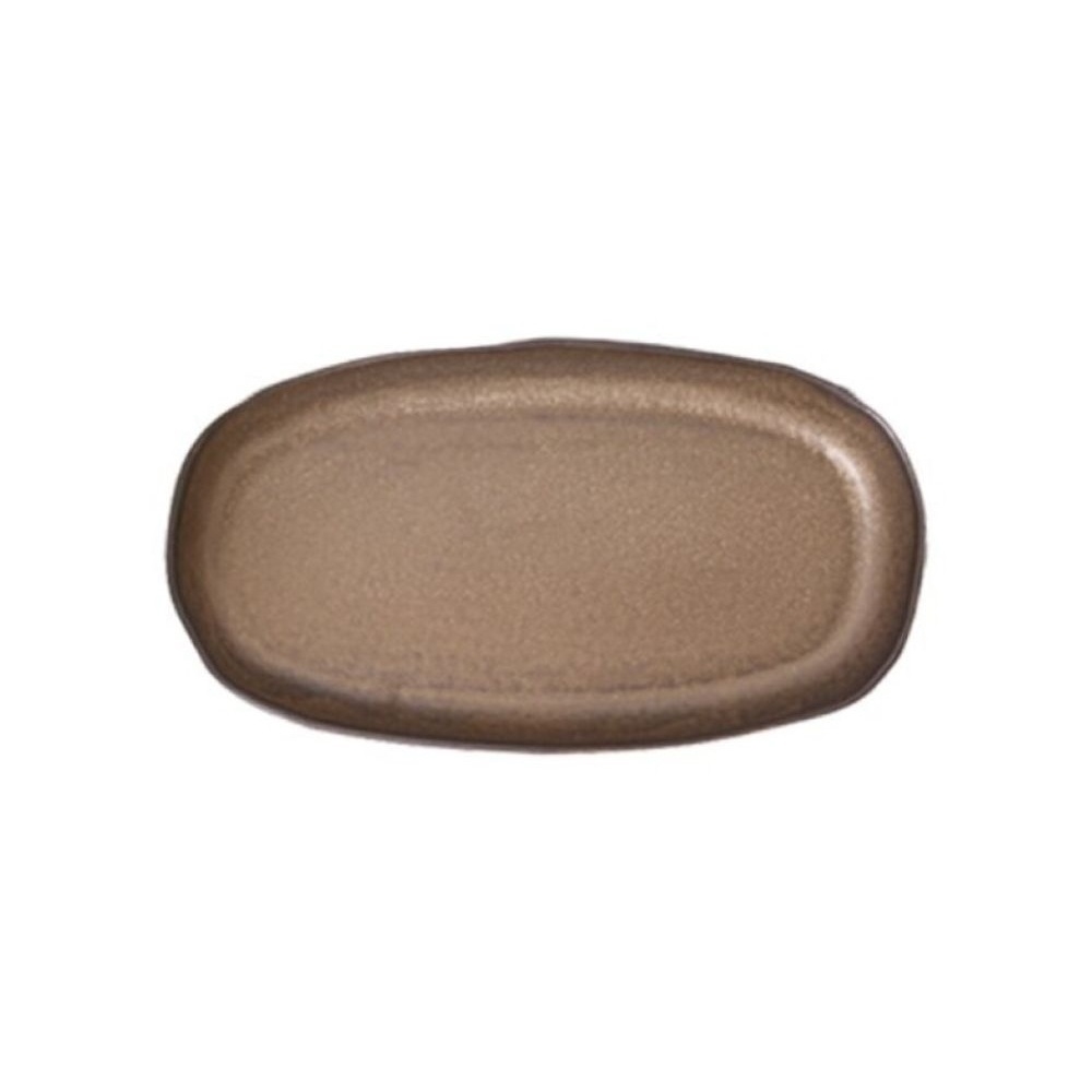 The Bronze Small Dish features a compact oval stoneware form with a mottled bronze glaze and hand-finished rim, ideal for kosher weddings, Shabbat dinners, and buffet setups for condiments or sides, styled with separate meat or dairy tableware, neutral dinner plates, and classic flatware for organized presentation.
