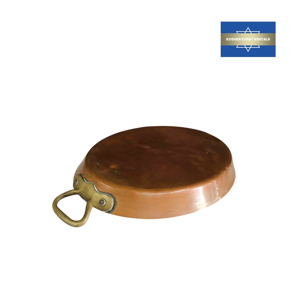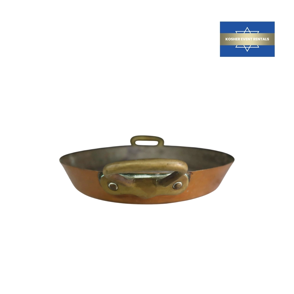 The Copper Oval Pan features a brushed copper exterior with a distressed metallic interior and brass handles, ideal for kosher weddings, Shabbat buffets, and catered events, styled with separate meat or dairy tableware, neutral dinner plates, and classic flatware for organized serving.